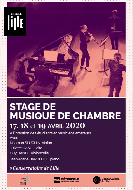 Nous attirons également votre attention sur le stage de musique de chambre pour étudiants et musiciens amateurs qui se déroulera les 17,18, et 19 avril 2020 au conservatoire de Lille, avec Naaman Sluchin, violon, Juliette Danel, alto, Guy Danel, violoncelle et Jean-Marie Bardèche, piano. Les inscriptions sont ouvertes.