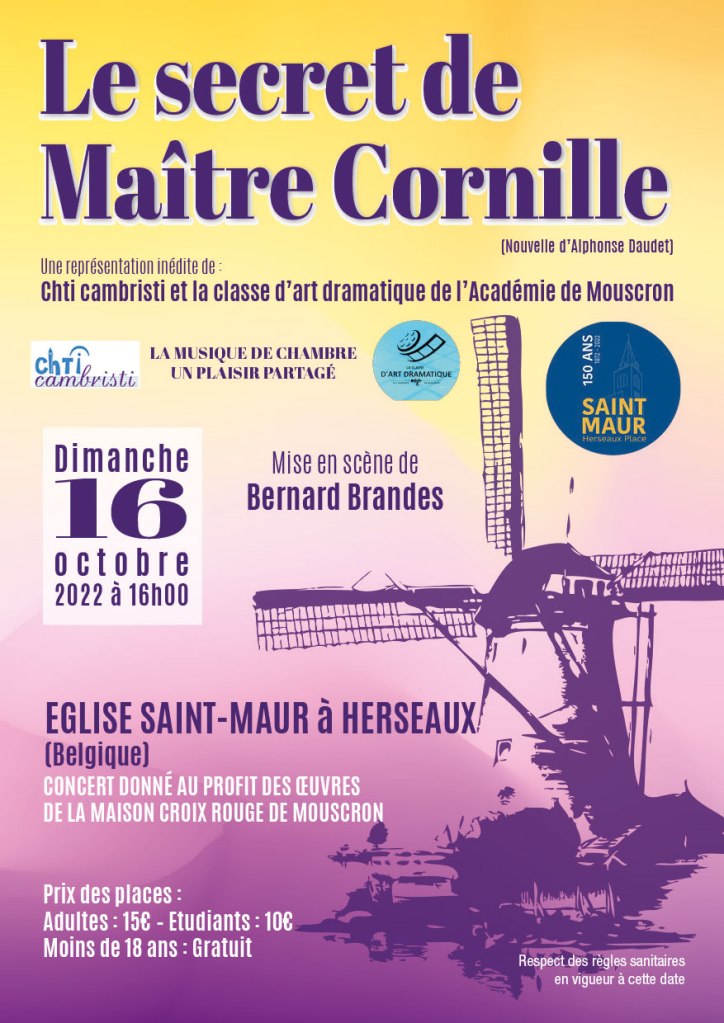 Il s’agit d’un concert très original qui se tiendra le Dimanche 16 octobre à 16h à Herseaux (B) (près de Mouscron à la frontière belge) en collaboration avec la classe d’art dramatique de l’académie de Mouscron.