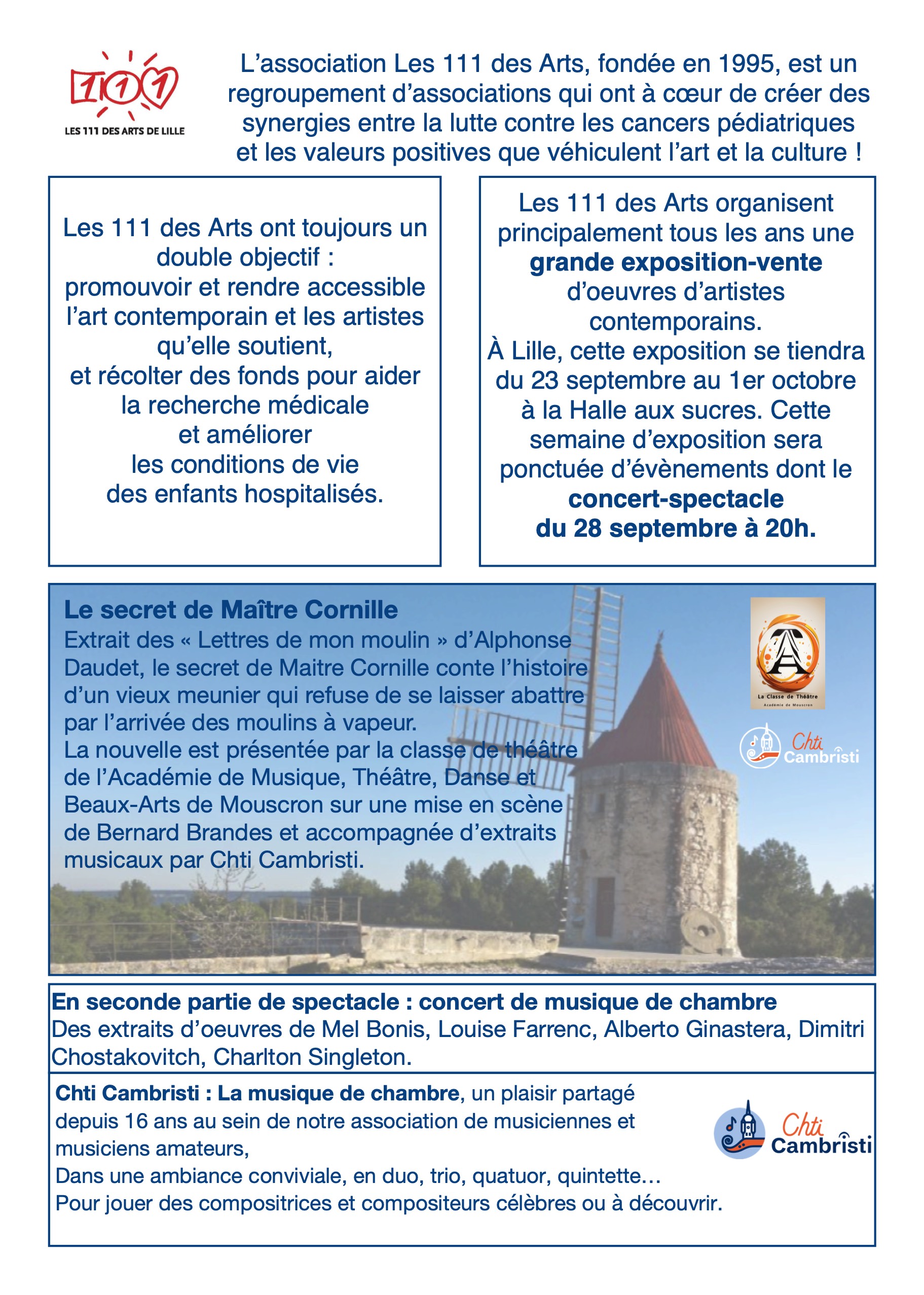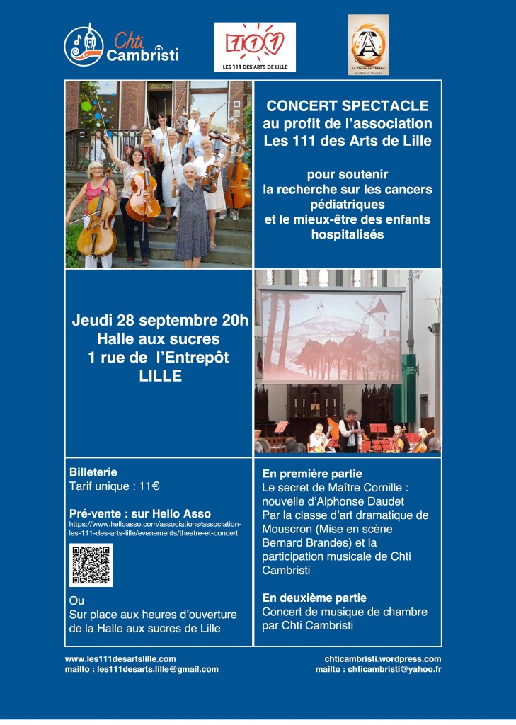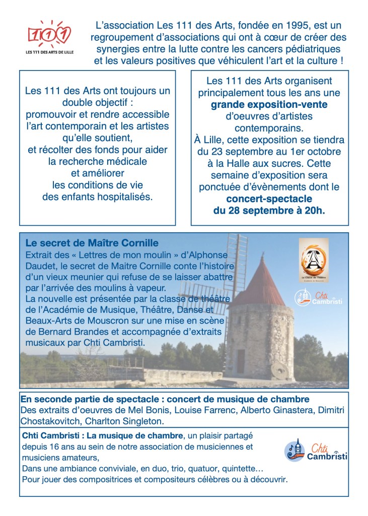 Nos activités reprennent après la trève estivale. Signalons en particulier un concert-spectacle le 28 septembre 2023 au profit de l’Association « Les 111 des Arts » qui collecte des fonds pour soutenir la recherche sur les cancers pédiatriques.