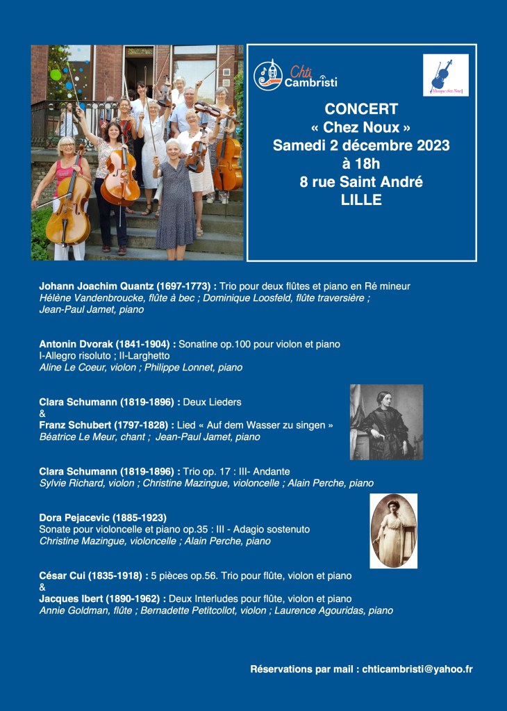Nous vous invitons à venir écouter notre prochain concert de musique de chambre qui mettra à l’honneur notamment deux compositrices, Clara Schumann-Wieck et Dora Pejacevic. Le nombre de places étant limité, merci de réserver par mail : chticambristi@yahoo.fr
