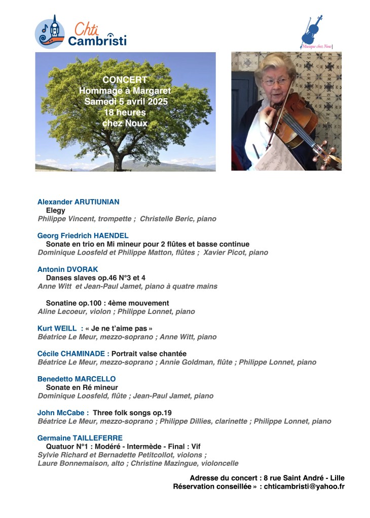 Nous voudrions lui rendre hommage lors du prochain concert « Chez Noux » qui aura lieu le samedi 5 avril 2025 à 18h. En voici le programme :